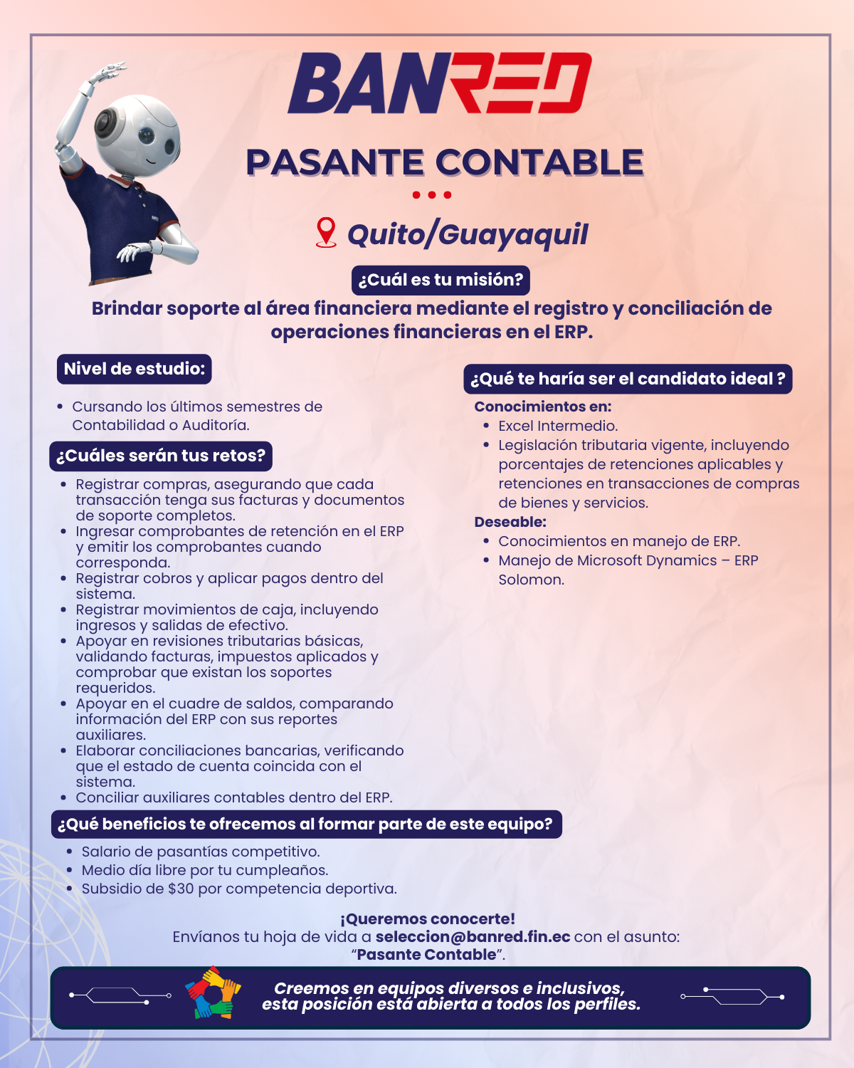 Contamos con algunos procesos de selección activos. Si cumples con el perfil que buscamos, envíanos tu hoja de vida al correo electrónico seleccion@banred.fin.ec detallando en el título del correo el cargo al que aplicas.